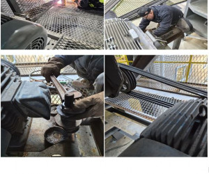각부 모터와 벨트 회전부와 회전부를 분리하는 바닥철망(EX-MATAL) 그리고 사각파이프로 제작된 난간지지대는 ..