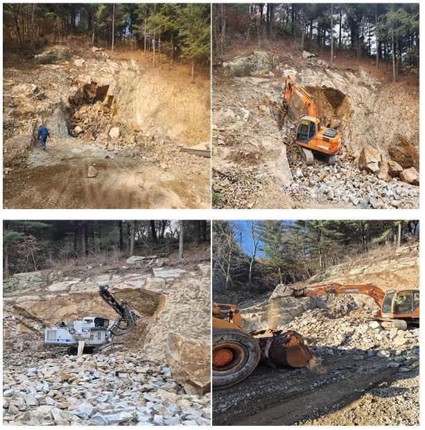 굴삭기의 앞부분을 브레이커(Breaker)로 교환하여 부피가 큰 암석으로 잘게 부숴 원광석 및 골재로 분류하였고, 분류된 원광석과 골재들은 각 장소에 맞게 이동 적재하였습니다.